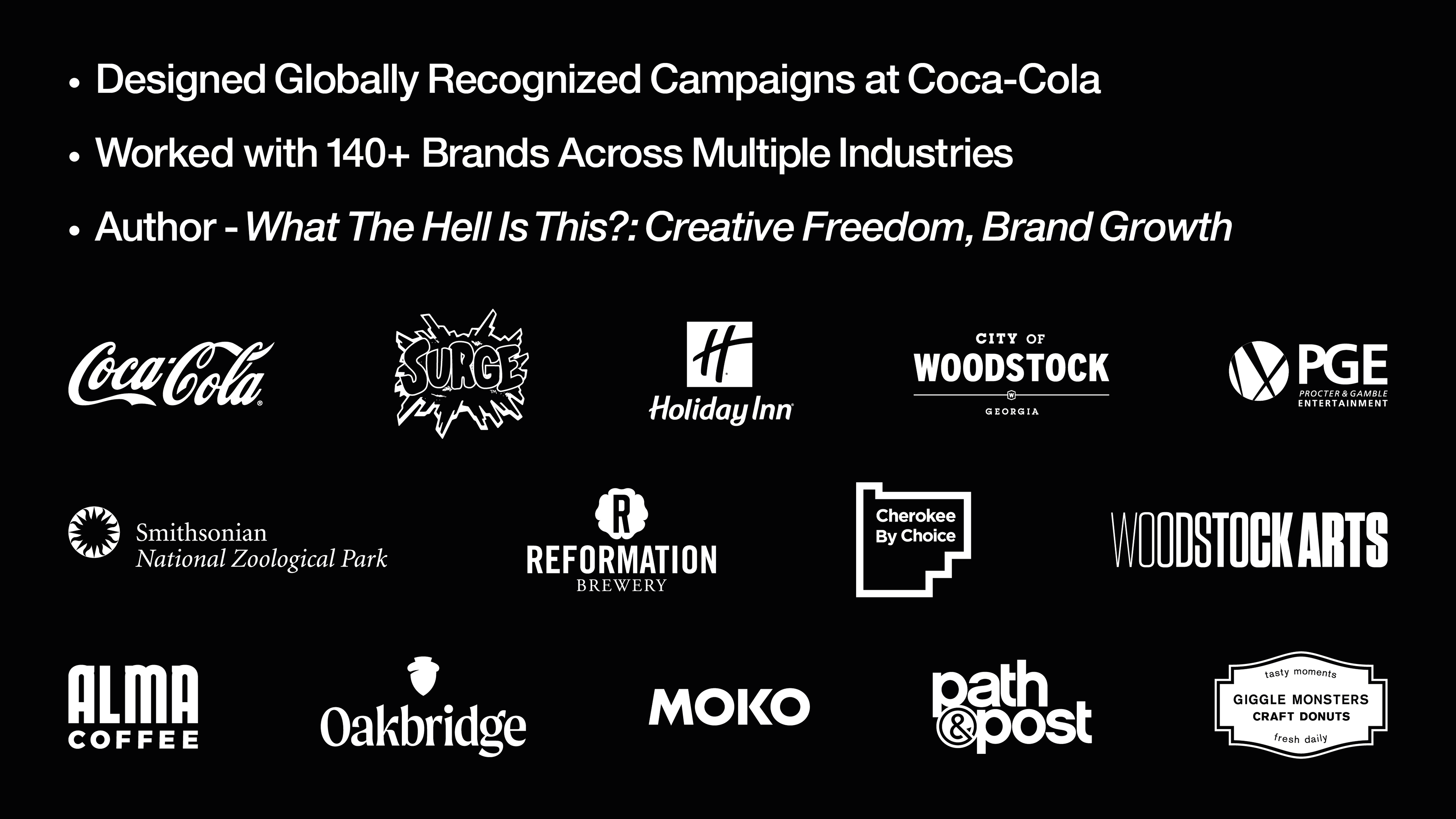 I create breakthroughs—the kind that change what people see. My 30+ years of experience spans the creation of iconic brand identities for Coca-Cola, Surge, Holiday Inn, the City of Woodstock, and many more. My process is a counterweight to generic prompts and standard creative briefs. My artistic intensity thrives at the intersection of youth culture, CPGs, entertainment, and destinations.